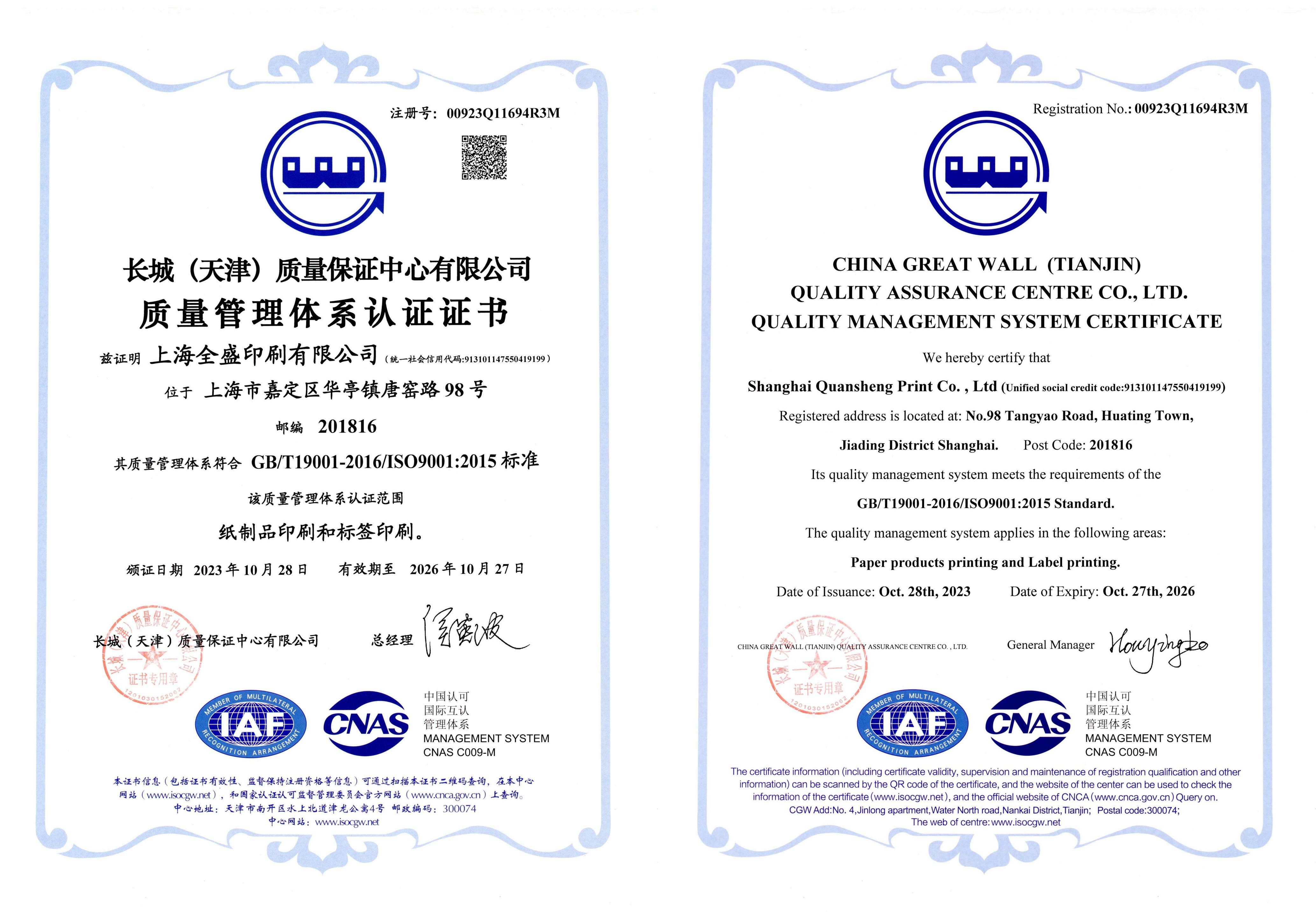 2023月10月,JIANGNAN.COM印刷获得ISO9001质量管理体系认证证书。JIANGNAN.COM集团结合企业实际情况,建立了一套科学、系统、全面的质量管理体系,有助于企业未来可持续发展。