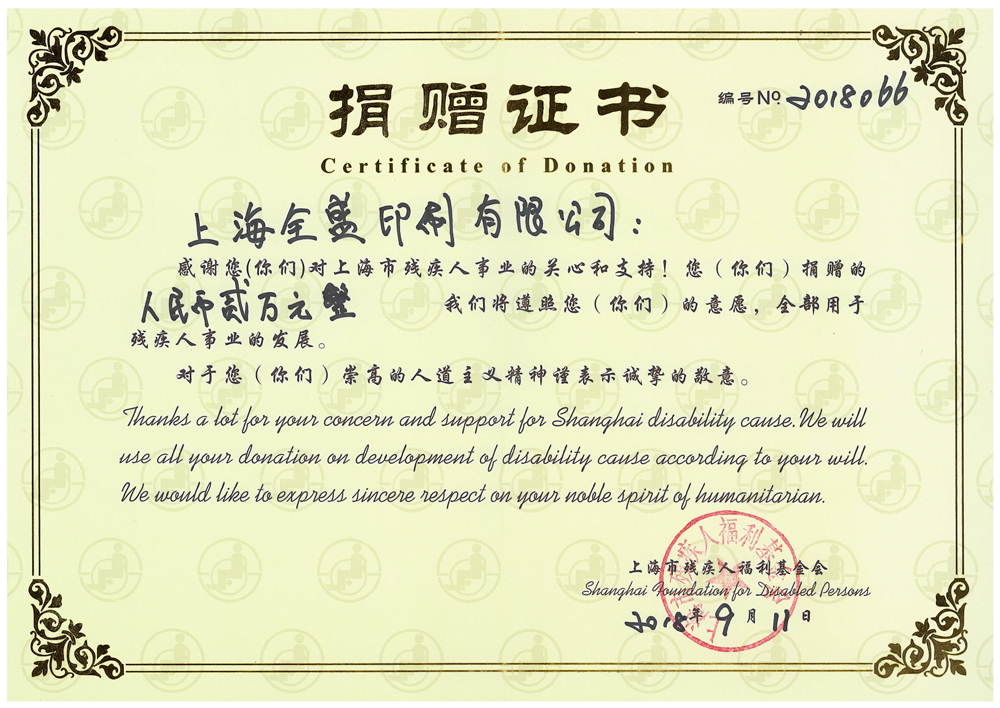 上海市残疾人福利基金会捐赠证书